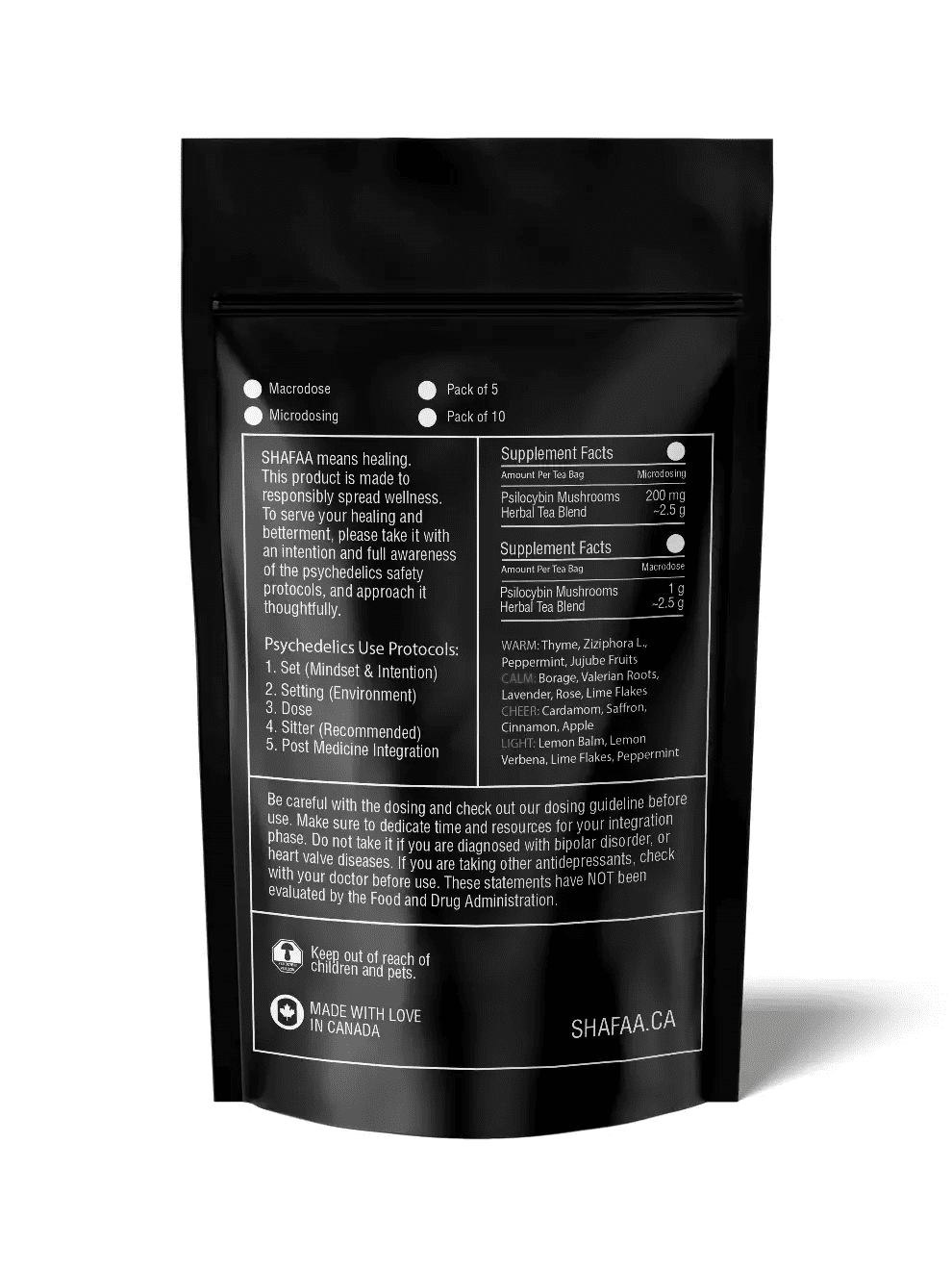 Each pouch includes 5 tea bags and is available in either microdose or macrodose strength. Both formulas use the same herb blend, with only the mushroom content changing.